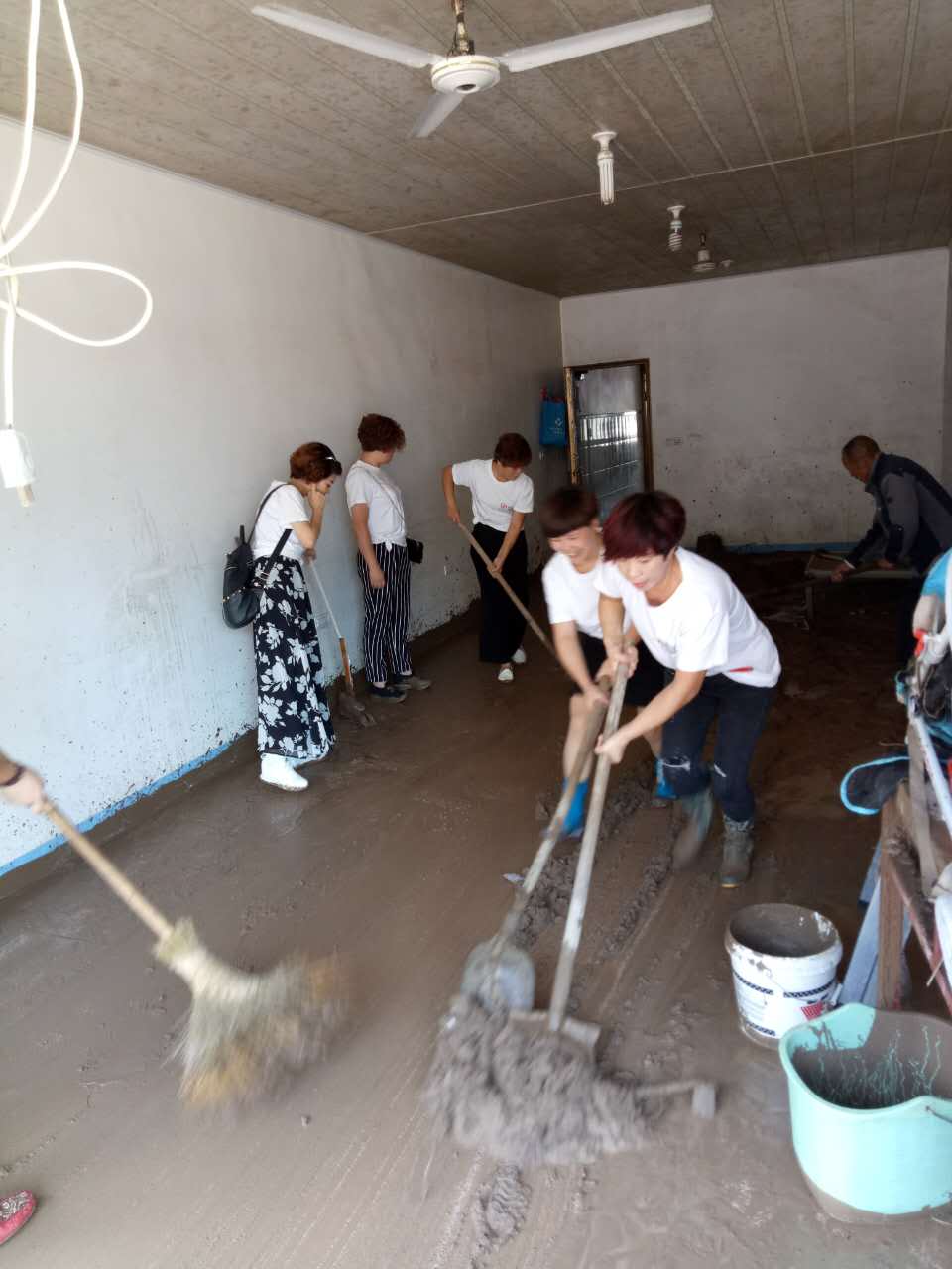 在此次爱心捐赠途中,小组成员们无意间看到一位70多岁的老爷爷,他正在清理家里地面上洪水冲过后留下的一层厚泥土,年迈的身体颇为吃力。见此情景,她们立即来到老爷爷家,拿起铁锹、扫帚等工具帮老爷爷打扫和处理家里的泥土。所有成员齐心协力、汗流浃背,半小时后将老爷爷家的地面收拾的一干二净,老爷爷对浪莎家人的帮助非常感恩,连声道谢。
