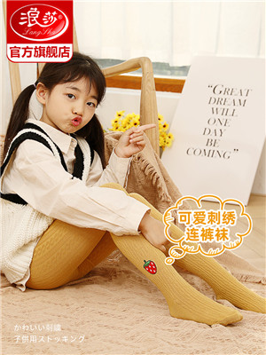 浪莎儿童连裤袜秋冬季女童刺绣草莓打底袜宝宝糖果色麻花条纹袜子